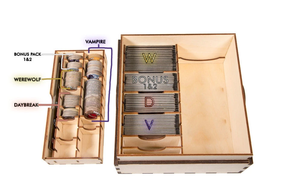 This is an officially licensed box organizer compatible with One Night Ultimate Collection games by Bézier Games. ©2015 The Broken Token. Bézier Games, One Night Ultimate Werewolf, One Night Ultimate Daybreak, One Night Ultimate Vampire, One Night Ultimate Alien, and their logos are trademark of Bézier Games, Inc., 809 Kozera Dr., San Jose, CA 95136, USA. www.BezierGames.com
