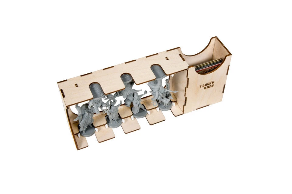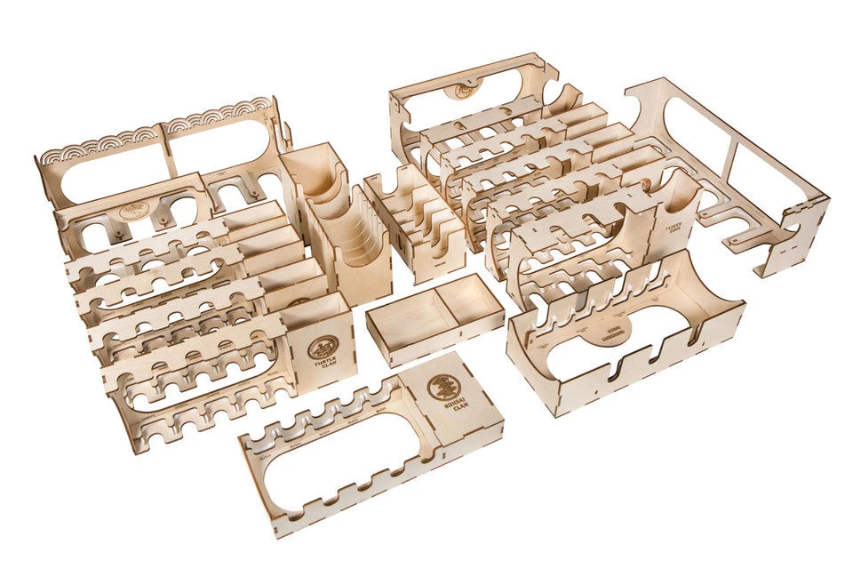 The Daimyo Collection Organizer includes everything from the Core Box Organizer and an additional 8 trays to organize the Kickstarter Exclusive Daimyo box and add-ons and expansions. The 3 monster trays feature the same new acrylic spring clips and hold all the Kickstarter exclusive monsters and the 4 Monster Pack miniatures. A single tray holds all the Kami Unbound miniatures and the cards. 3 trays hold the Dynasty Invasion expansion, 2 clan trays and the 7 Lucky Gods tray. There is also one more clan tray for the Kickstarter exclusive Fox clan.