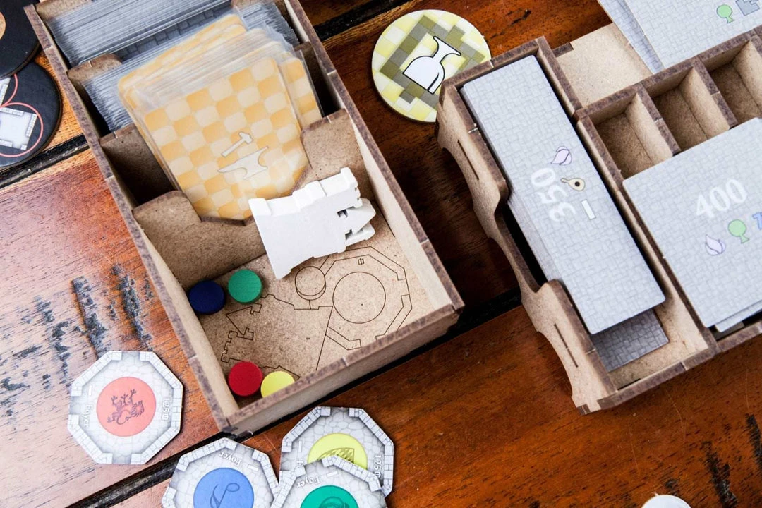 • 1x easy pick box with spaces for swans (expansion) tokens, 1000 value coins, 5000 value coins and secret passages (expansion).