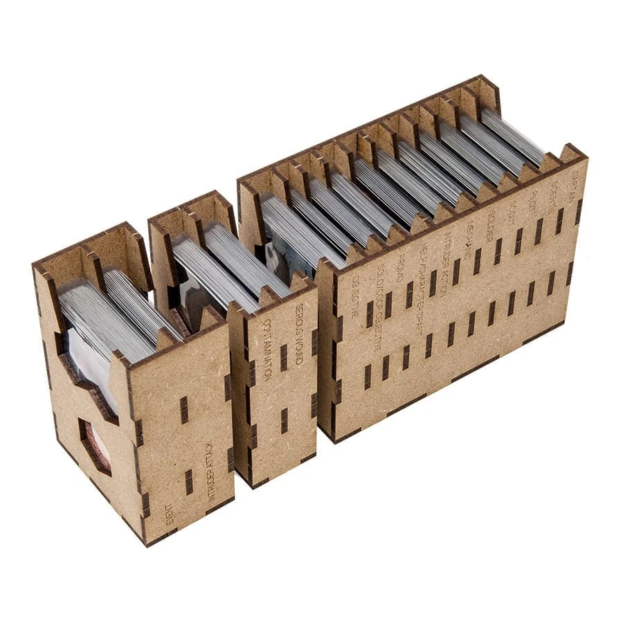 Designed to fit into the game box. Designed for both sleeved and unsleeved cards.