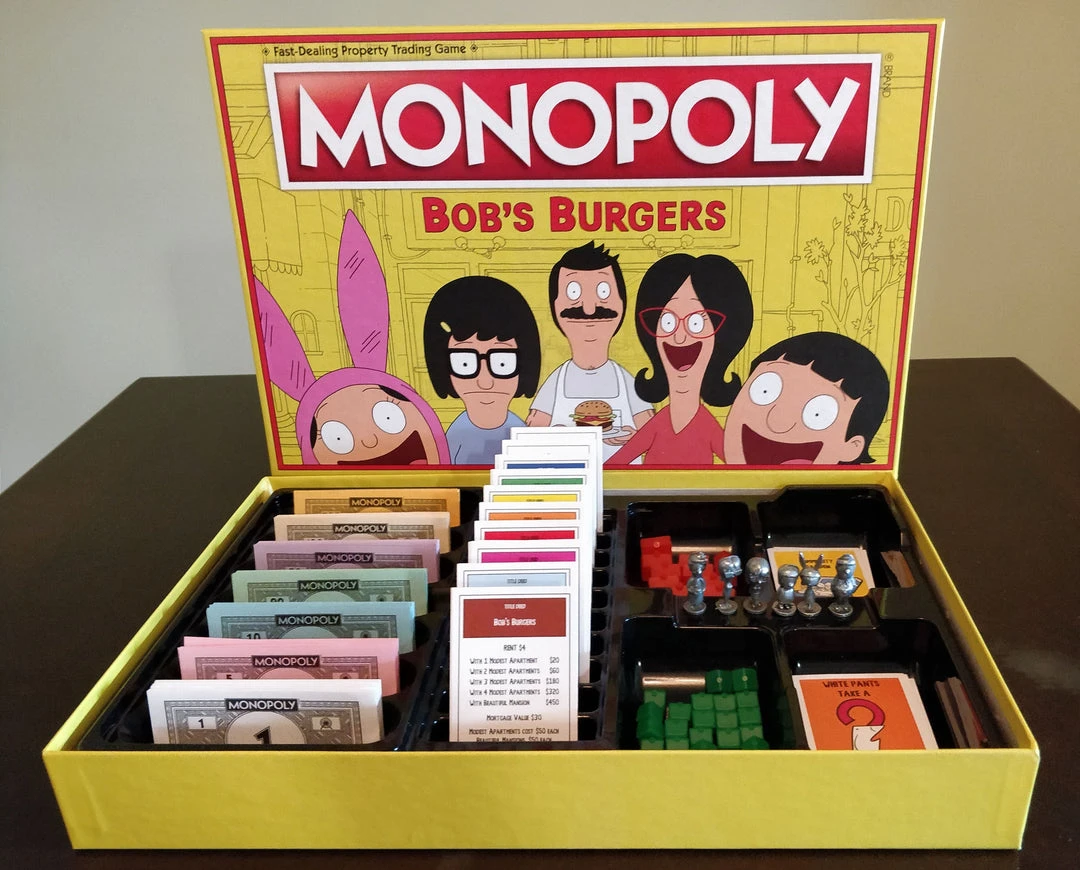 It’s Monopoly with a “Bob’s Burgers” twist! Same as original Monopoly, with all of the board spaces, cards, and tokens done over in a Bob’s Burgers theme. Includes 6 collectible pewter tokens.