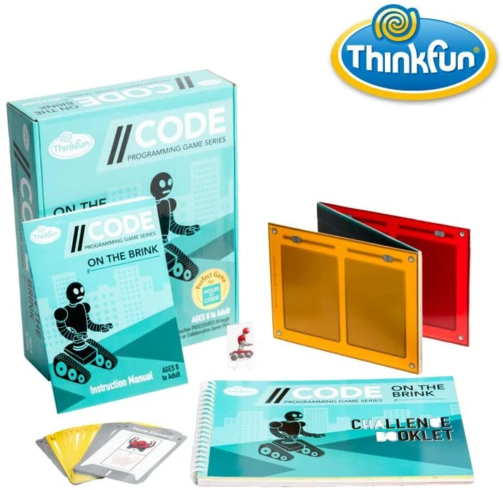 On the Brink is the first in a series of games designed to build the mental skills needed to fully grasp the concept of coding. All of the games are screen-free for a unique, unplugged play experience. Each of the 40 On the Brink challenges contains a map of colored squares. Each color has pre-programed moves for your Robot to perform. Use your problem-solving skills to determine the moves that will successfully get your Robot from start to finish. On the Brink is a fun and challenging step up from more simple sequencing games like Robot Turtles.
