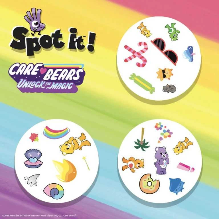 Unlock the magic in this fun and competitive pattern recognition game with a pop culture twist for a new way to enjoy your 80s favorites! In Care Bears Spot It!, there is only one matching character or item between any two cards. Be the first one to spot pairs of four-leaf clovers, donuts, and other symbols from the colorful Kingdom of Caring to win!
