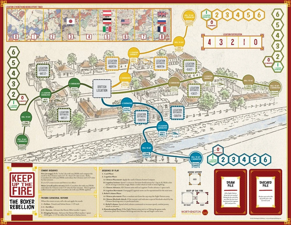 Keep Up The Fire! is a solitaire States of Siege series game set in 1900 Peking (modern day Beijing), China where Foreign Legations (areas assigned to Imperial powers including ambassadors, business people, and a handful of troops to provide security) are besieged in their Compound by Chinese anti-imperialist forces. The Chinese “Boxers” (Society of the Harmonious Fists), with the Imperial Manchu forces of the Qing Army, are angry and determined to expel these foreigners from China.