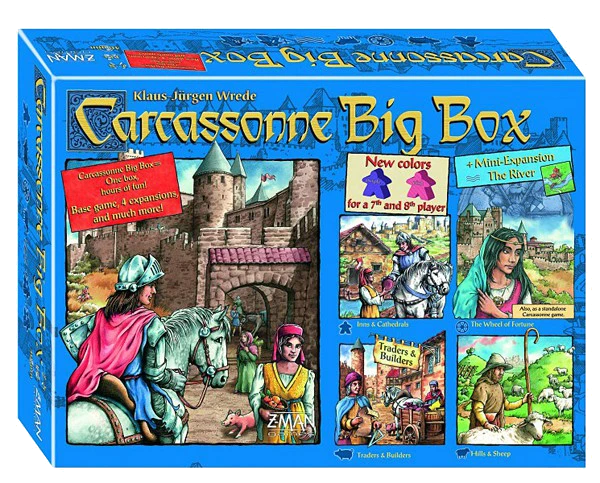 This Big Box is the same size as other Big Boxes, but with a slightly different component mix. This big box includes the basic game, Inns & Cathedrals, Traders & Builders, Wheel of Fortune, Hills & Sheep and The River.